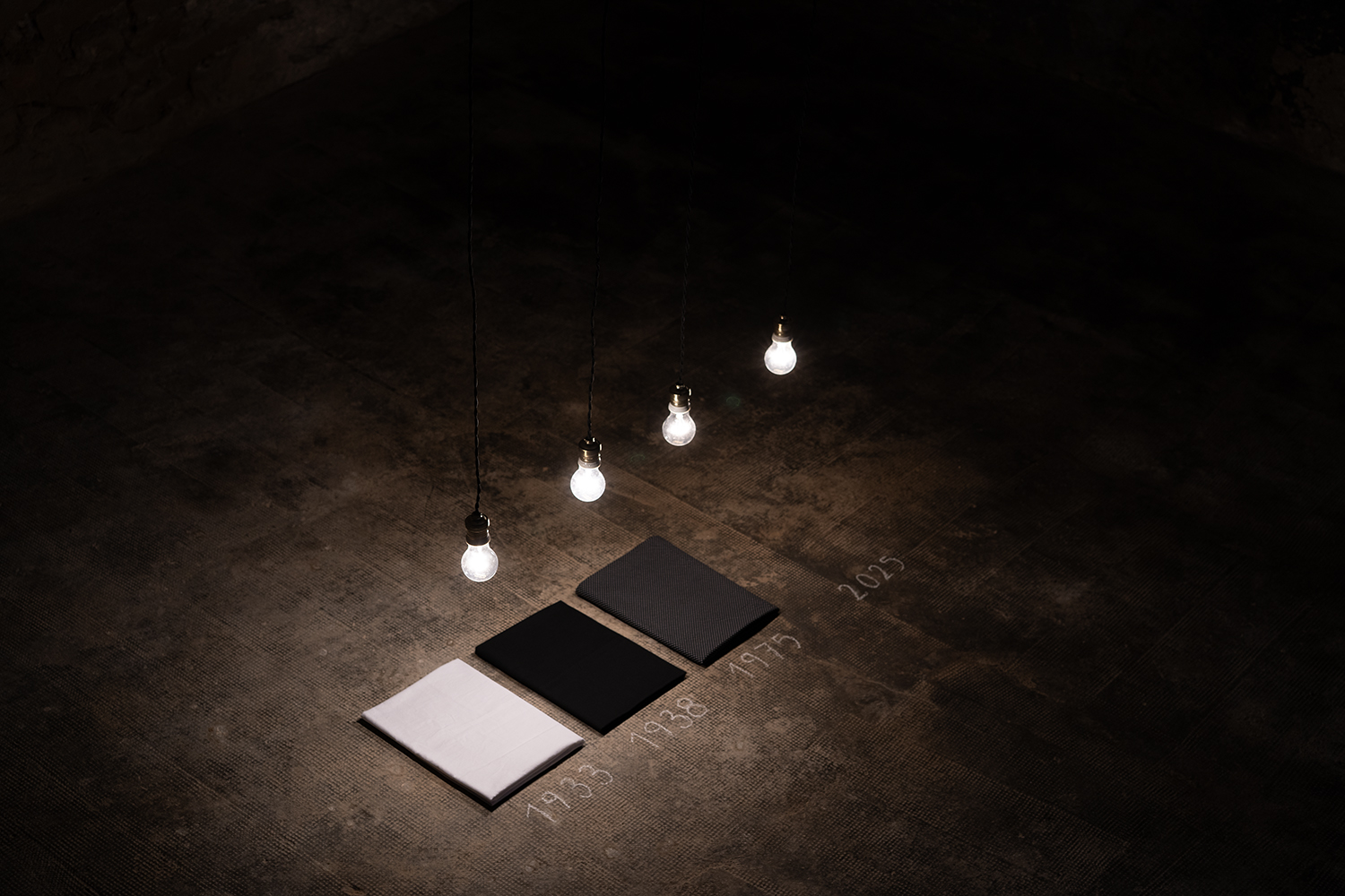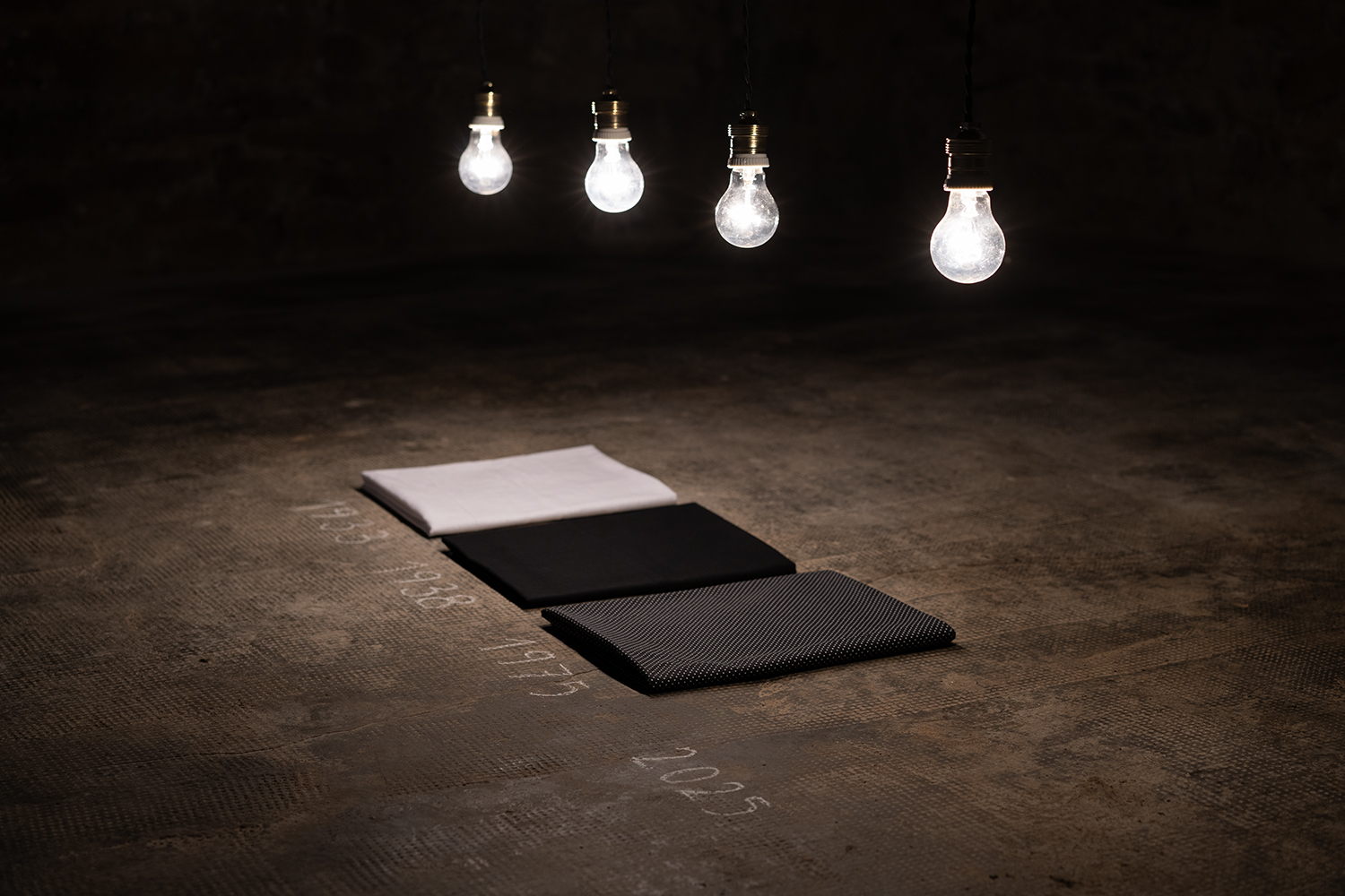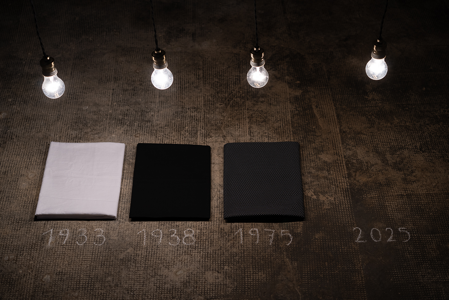 Vilafranca prison space, 4 light bulbs with the corresponding electrical circuits, 3 cotton fabrics measuring 1.38 x 1.15 m (white, black and black with small white dots) (the folded fabrics measure 32 x 24 cm) and the text written in white chalk (1933 / 1938 / 1975 / 2025).