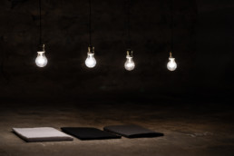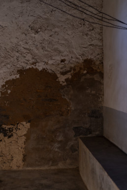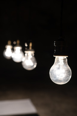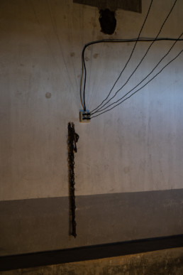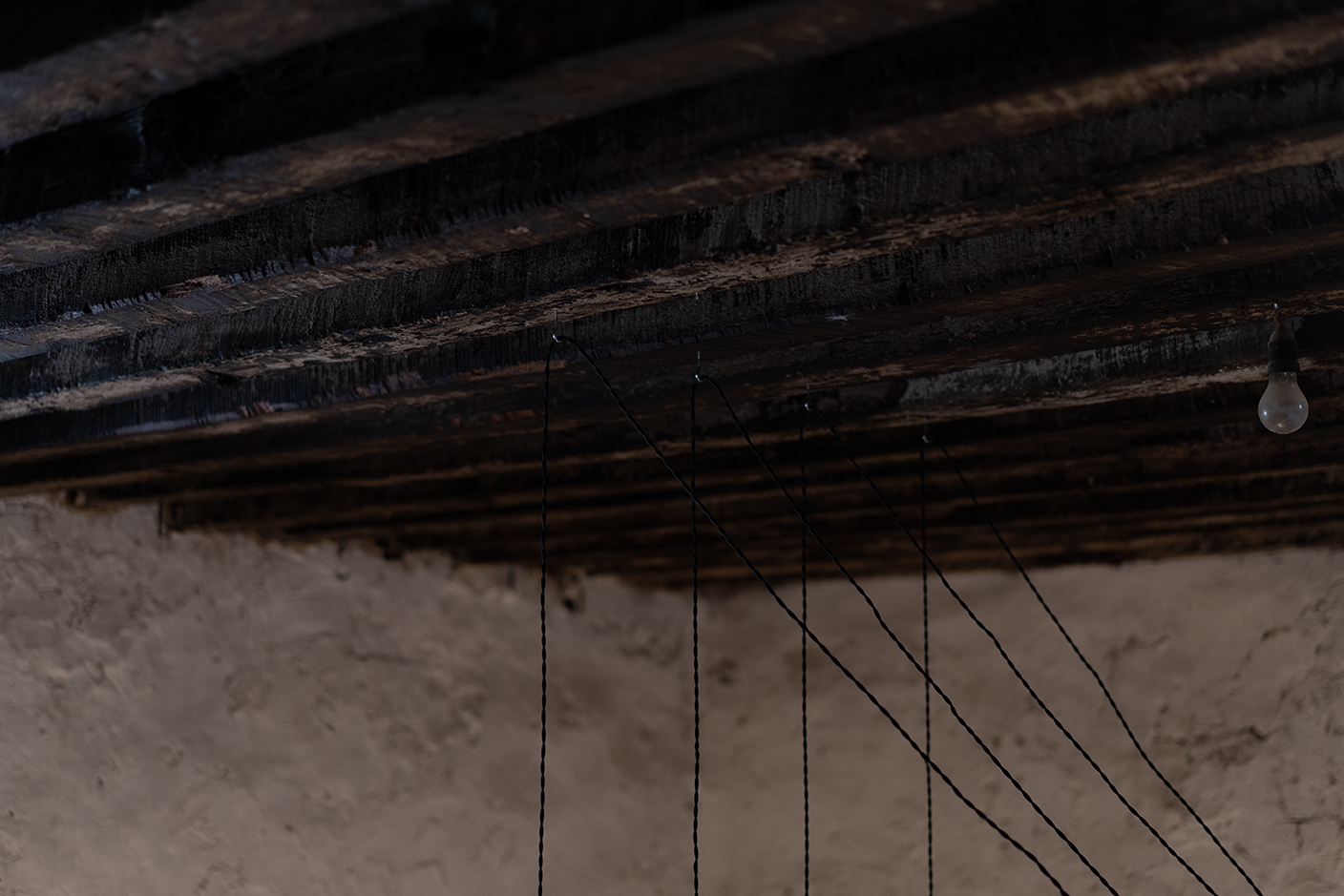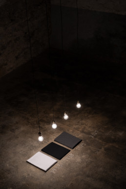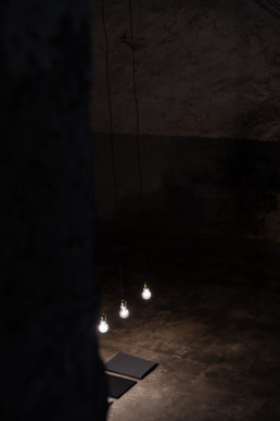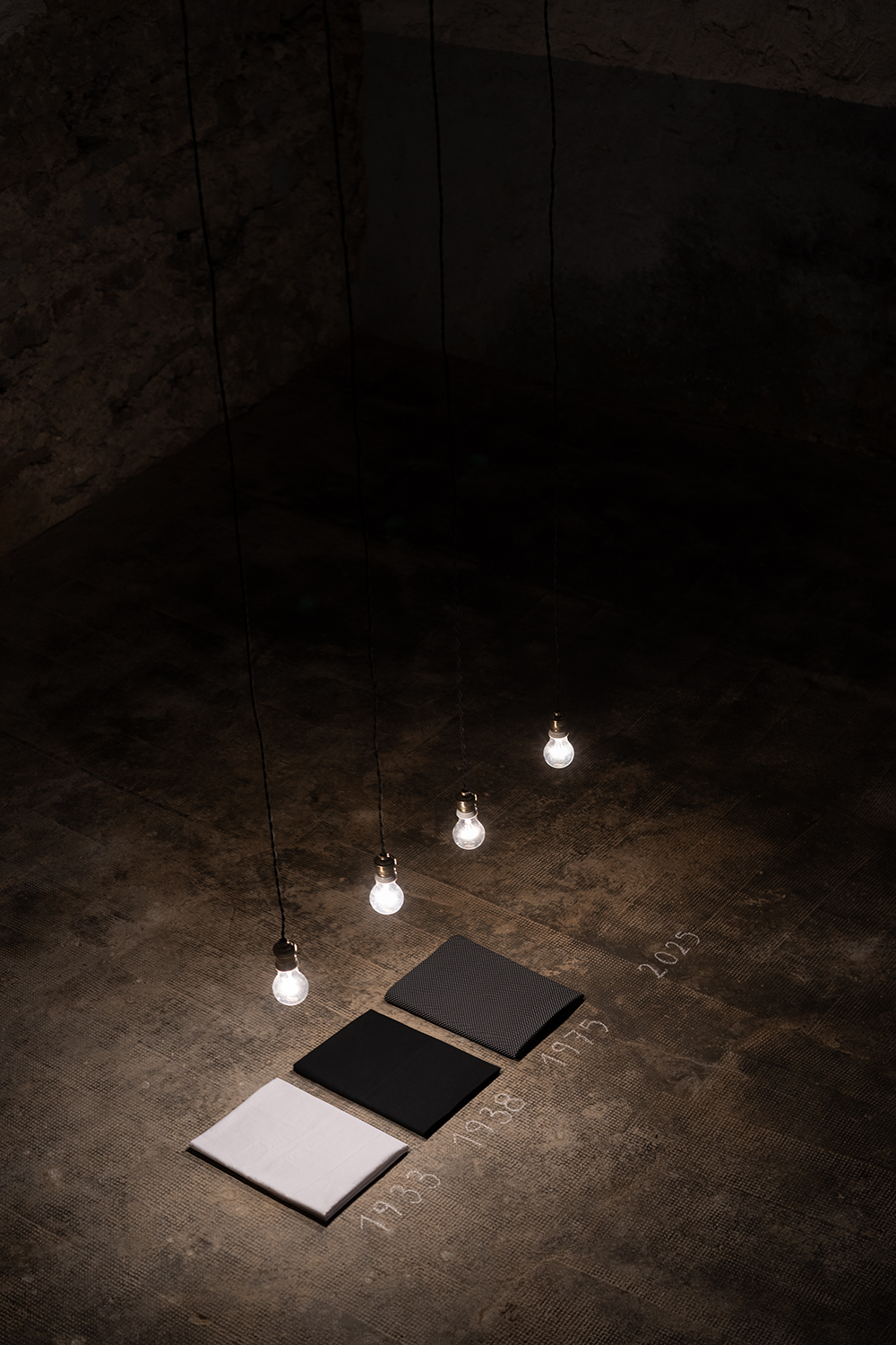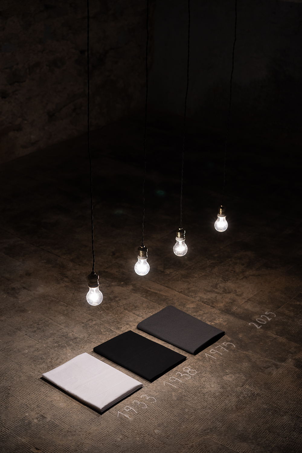 Vilafranca prison space, 4 light bulbs with the corresponding electrical circuits, 3 cotton fabrics measuring 1.38 x 1.15 m (white, black and black with small white dots) (the folded fabrics measure 32 x 24 cm) and the text written in white chalk (1933 / 1938 / 1975 / 2025).